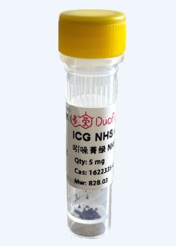 本产品的ICG是临床中所使用的ICG染料的衍生物。吲哚菁绿本身不带羧酸基团,所以不能用于生物标记实验,通过将吲哚菁绿中的一个磺酸根基团替换成羧酸基团,可以制备各种活化的吲哚菁绿,这是目前通用的吲哚菁绿染料标记方式。