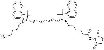 本产品是ICG NHS活化酯。可以直接和各种标记对象中的氨基反应,生成稳定的酰胺键。